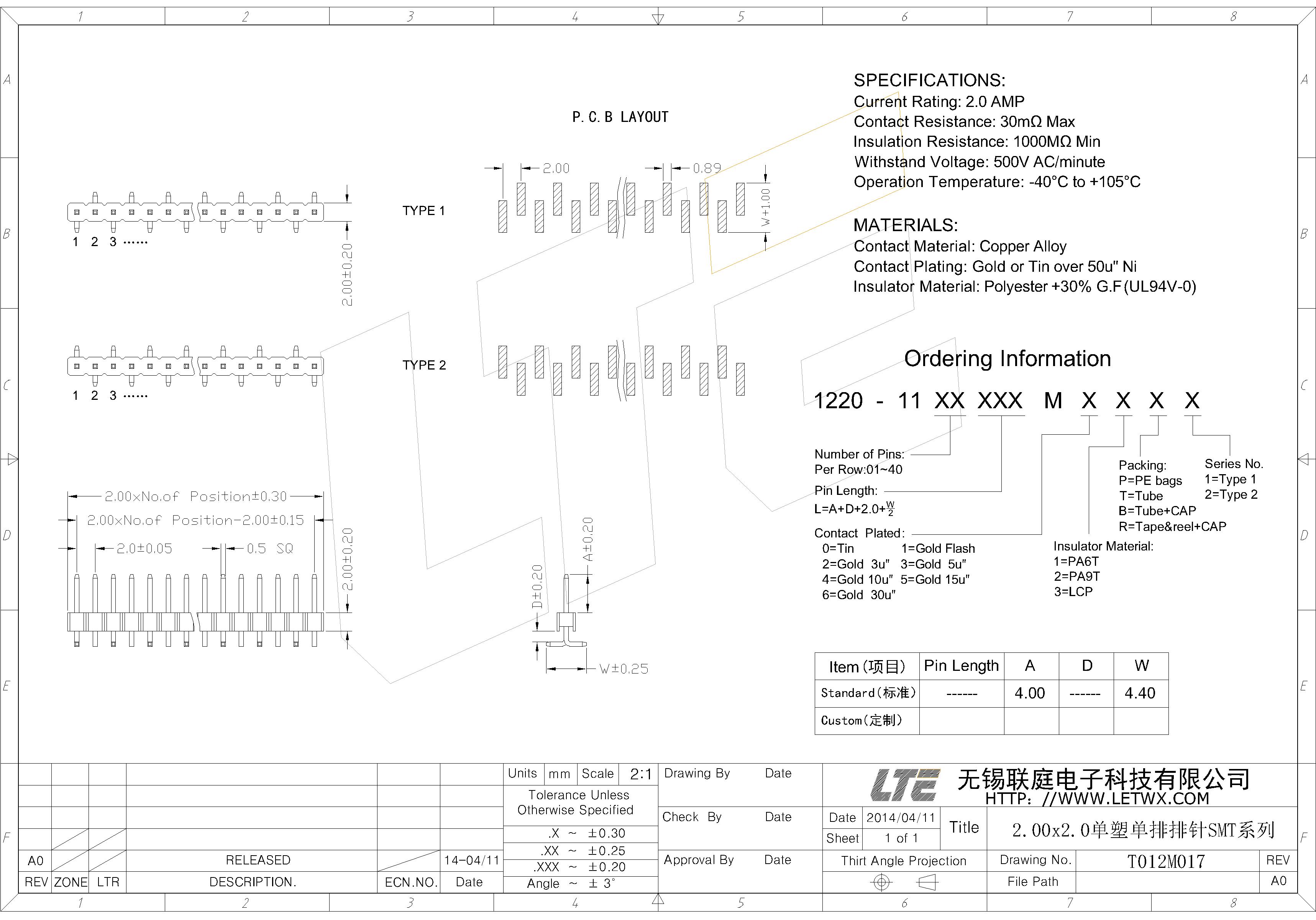 五金电镀(Contact Plating):镍底50U",外镀金或锡(Gold or Tin over 50u" Ni)