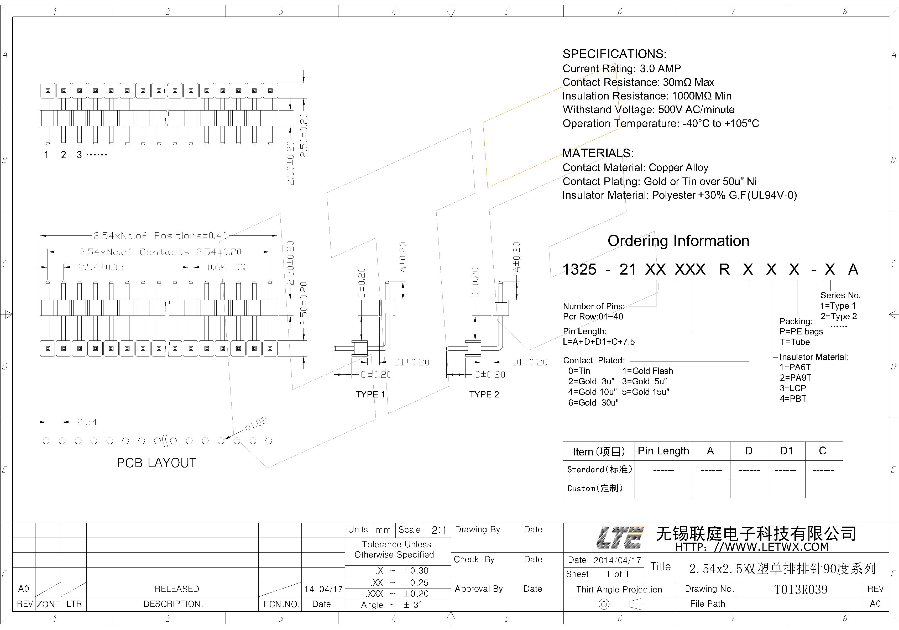 五金电镀(Contact Plating):镍底50U",外镀金或锡(Gold or Tin over 50u" Ni)