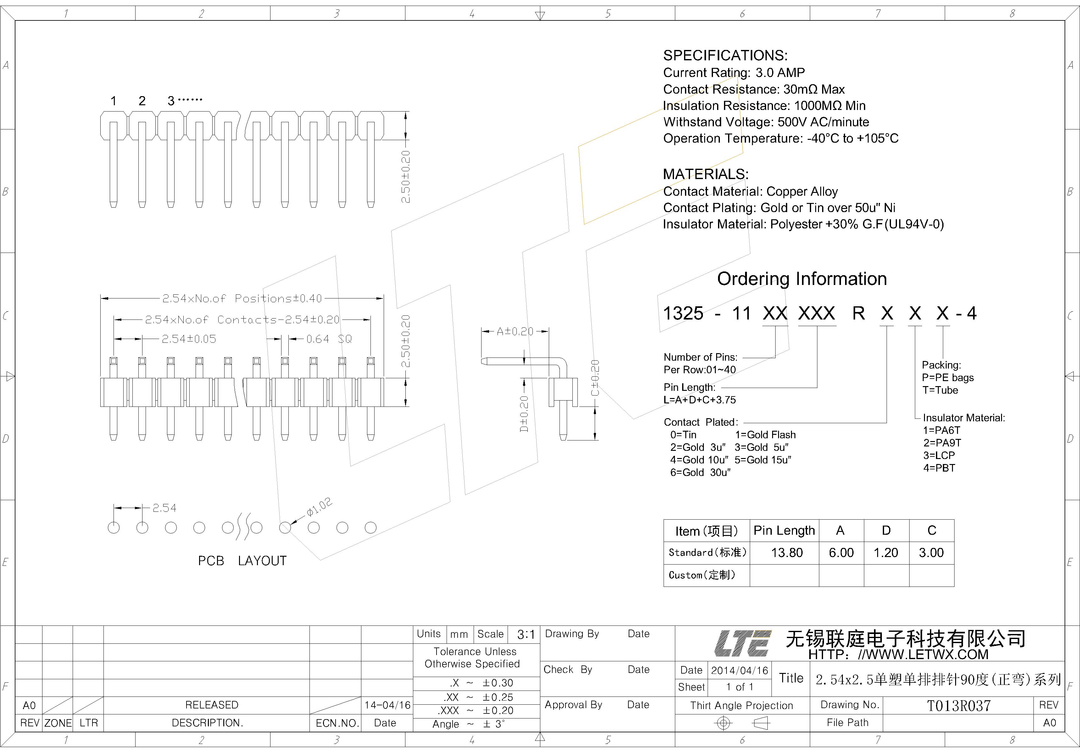 五金电镀(Contact Plating):镍底50U",外镀金或锡(Gold or Tin over 50u" Ni)