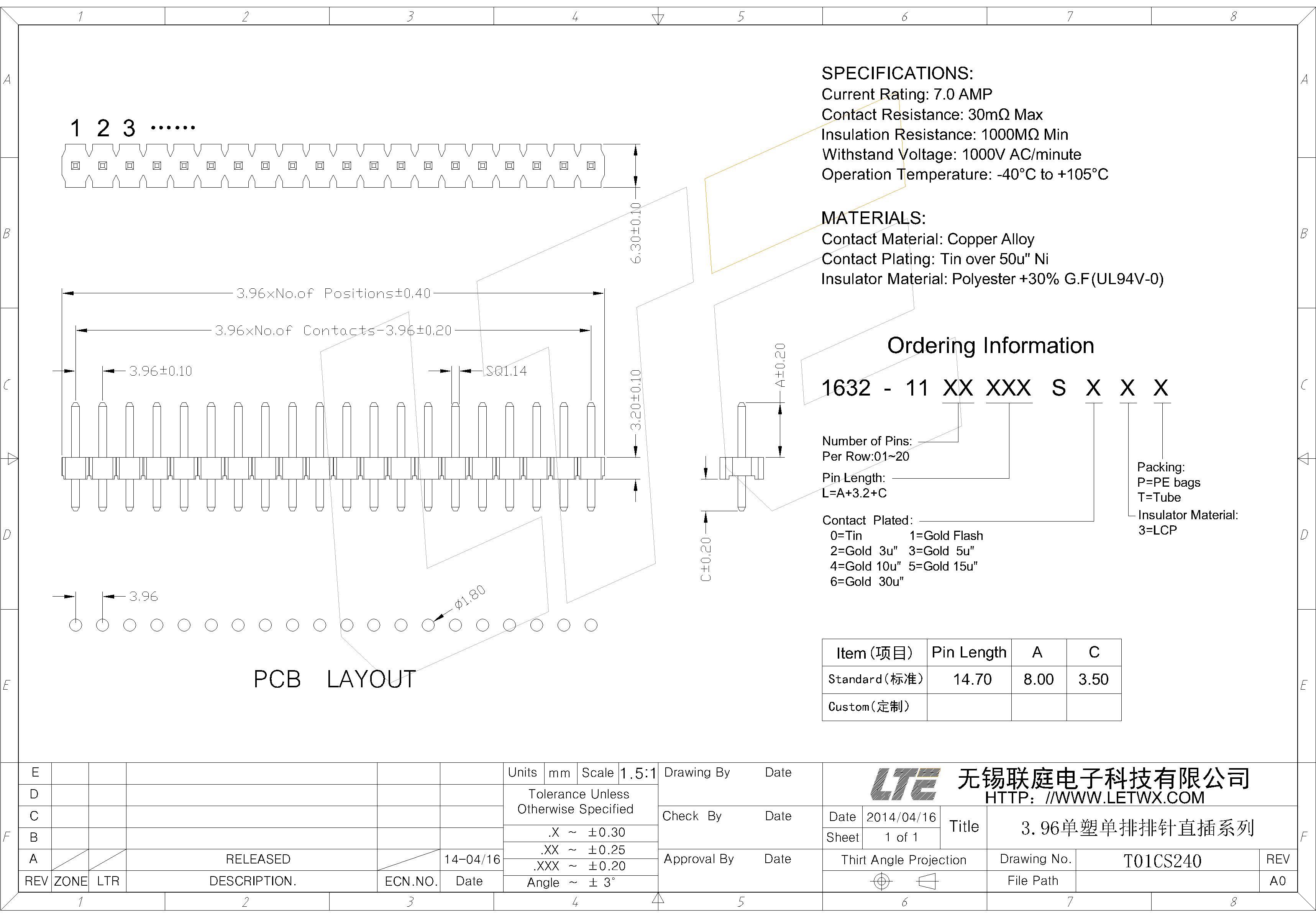 五金电镀(Contact Plating):镍底50U",外镀锡(Tin over 50u" Ni)