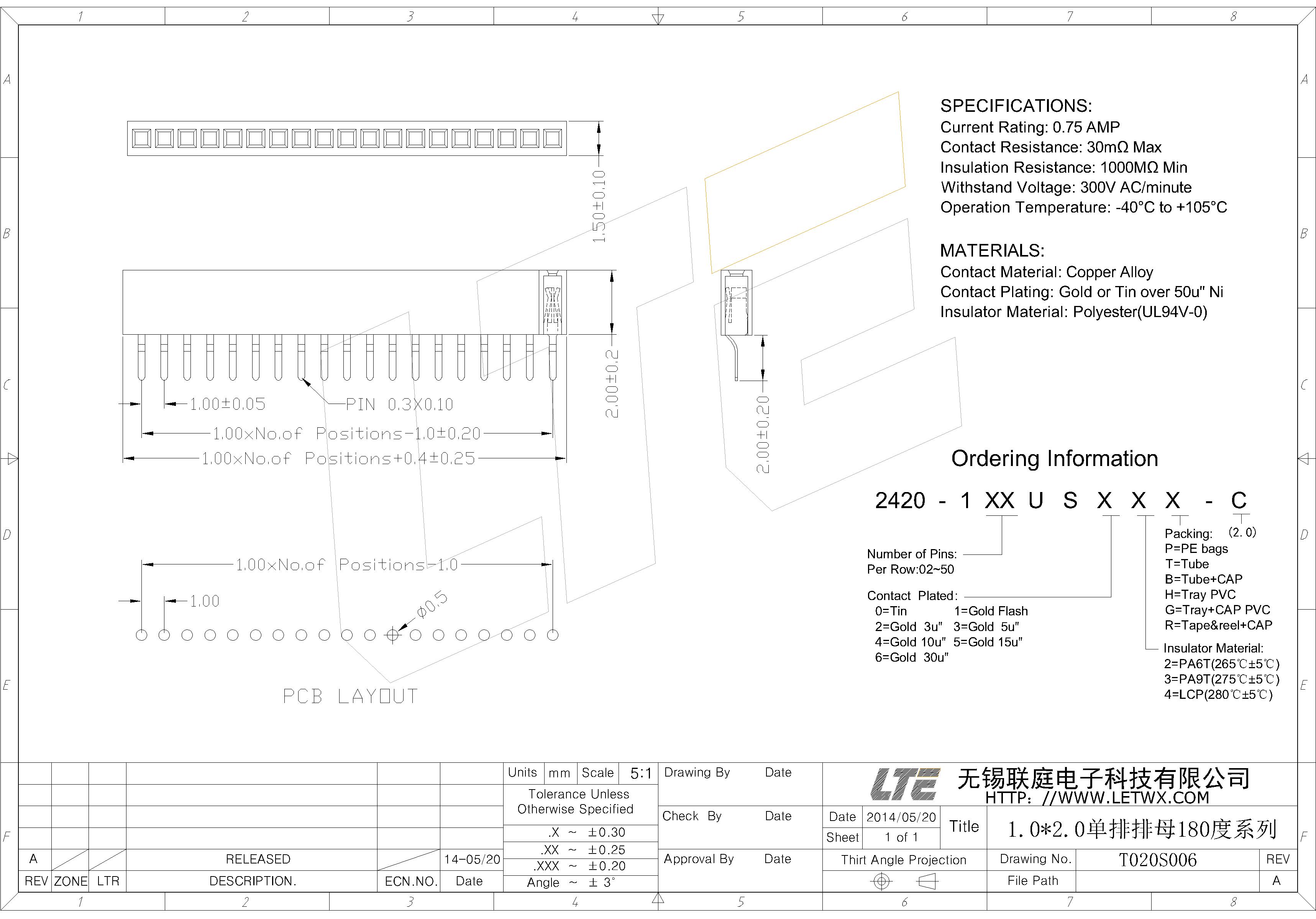 五金电镀(Contact Plating):镍底50U",外镀金或锡(Gold or Tin over 50u" Ni)
