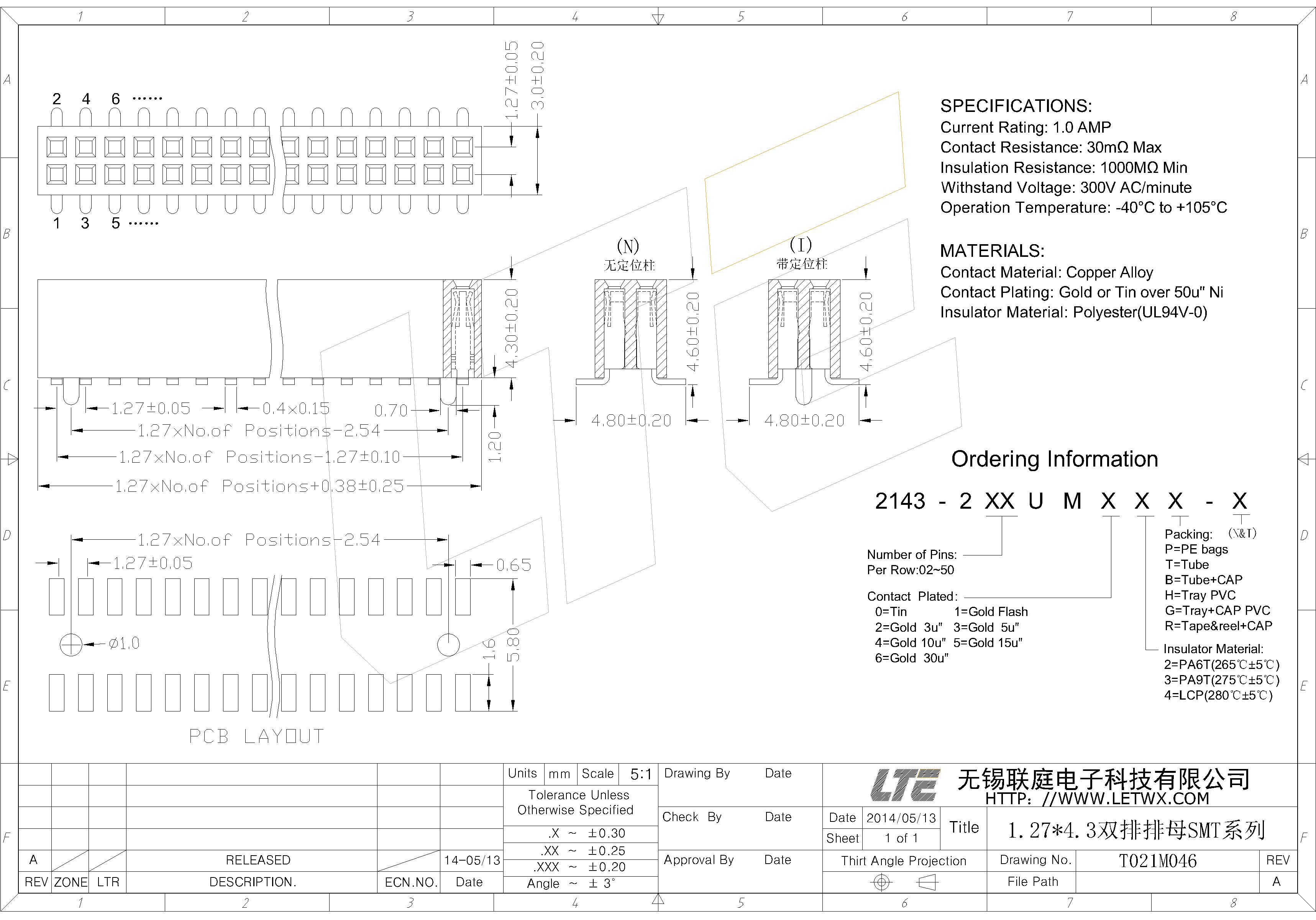 五金电镀(Contact Plating):镍底50U",外镀金或锡(Gold or Tin over 50u" Ni)