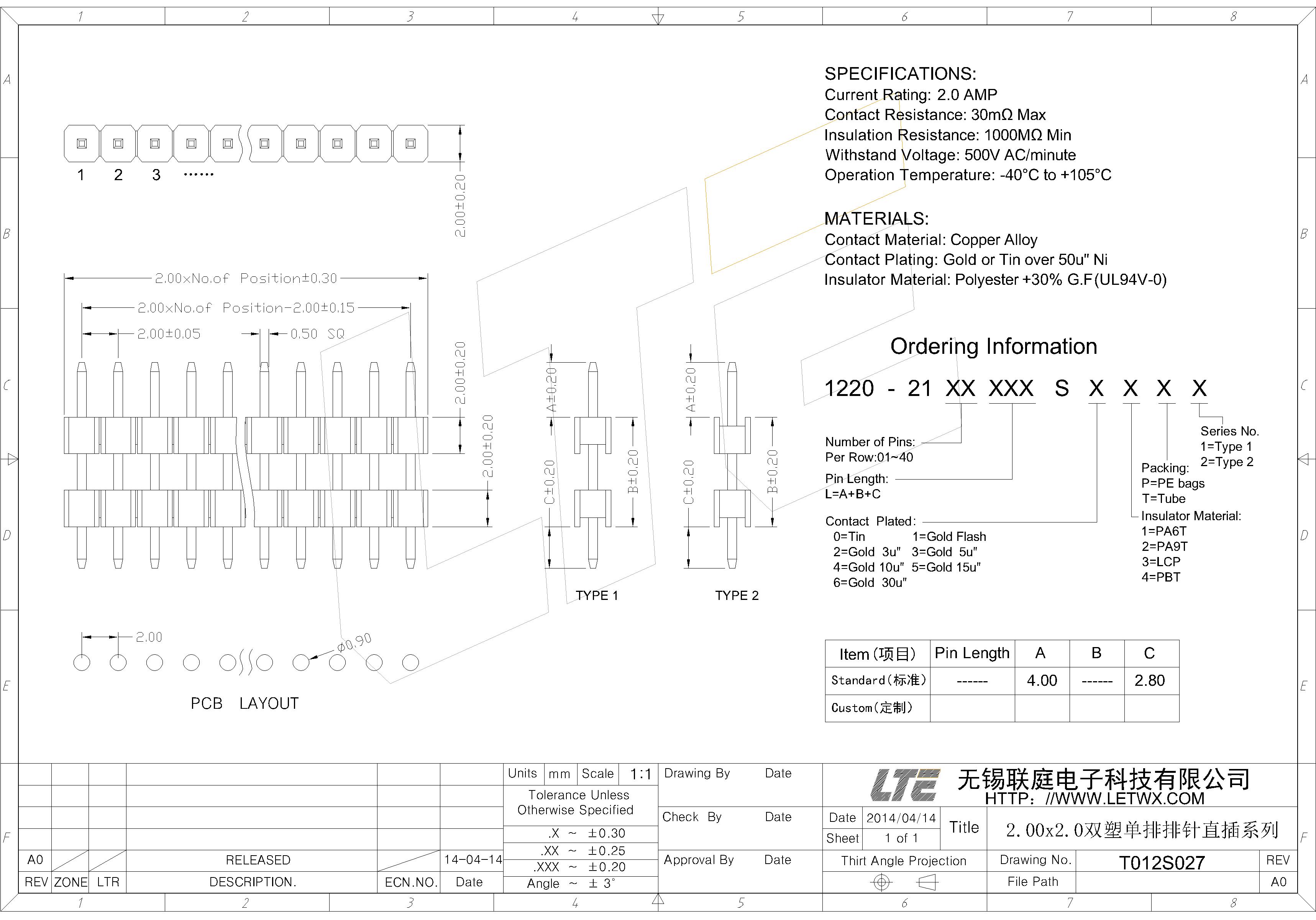 五金电镀(Contact Plating):镍底50U",外镀金或锡(Gold or Tin over 50u" Ni)