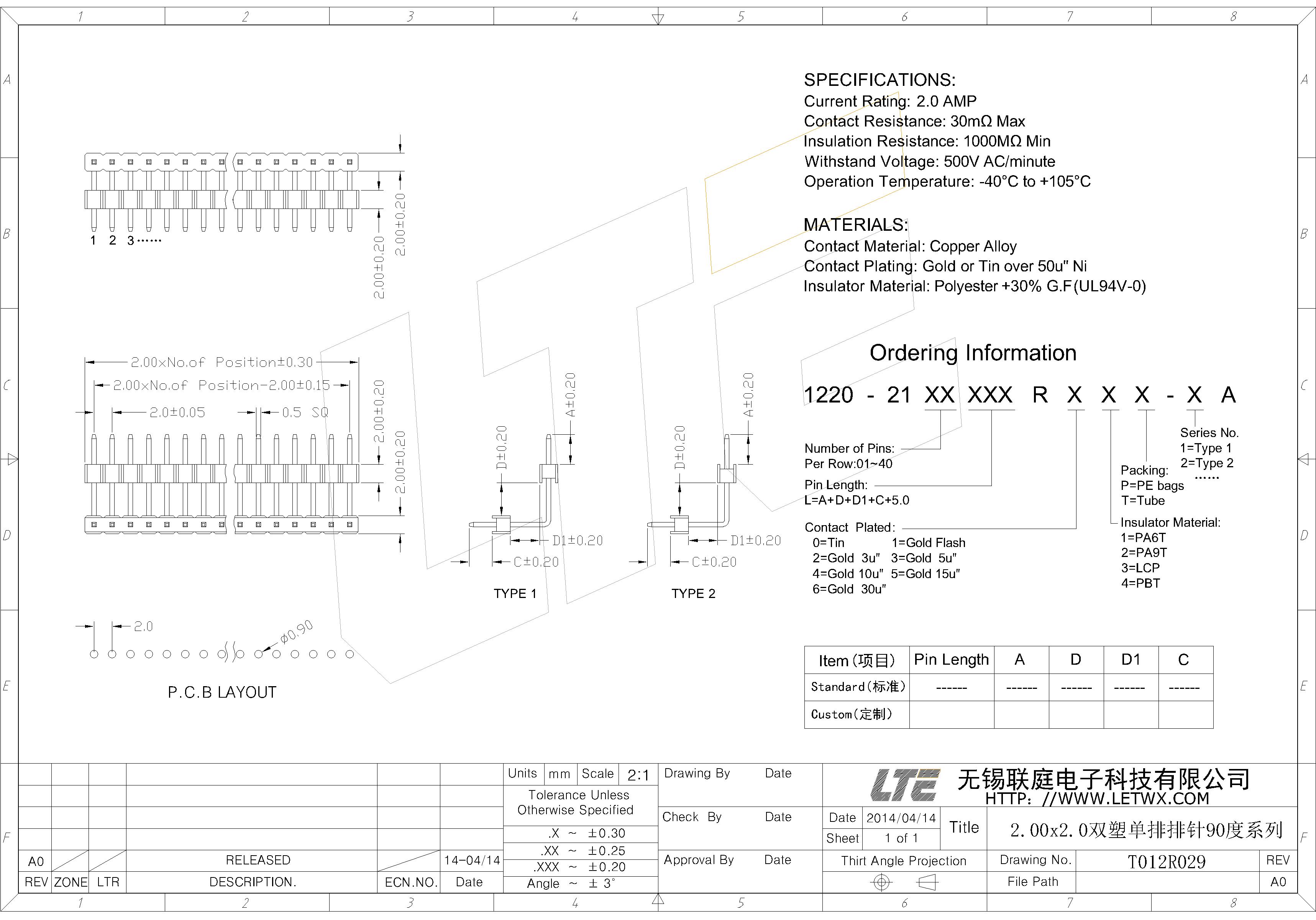 五金电镀(Contact Plating):镍底50U",外镀金或锡(Gold or Tin over 50u" Ni)