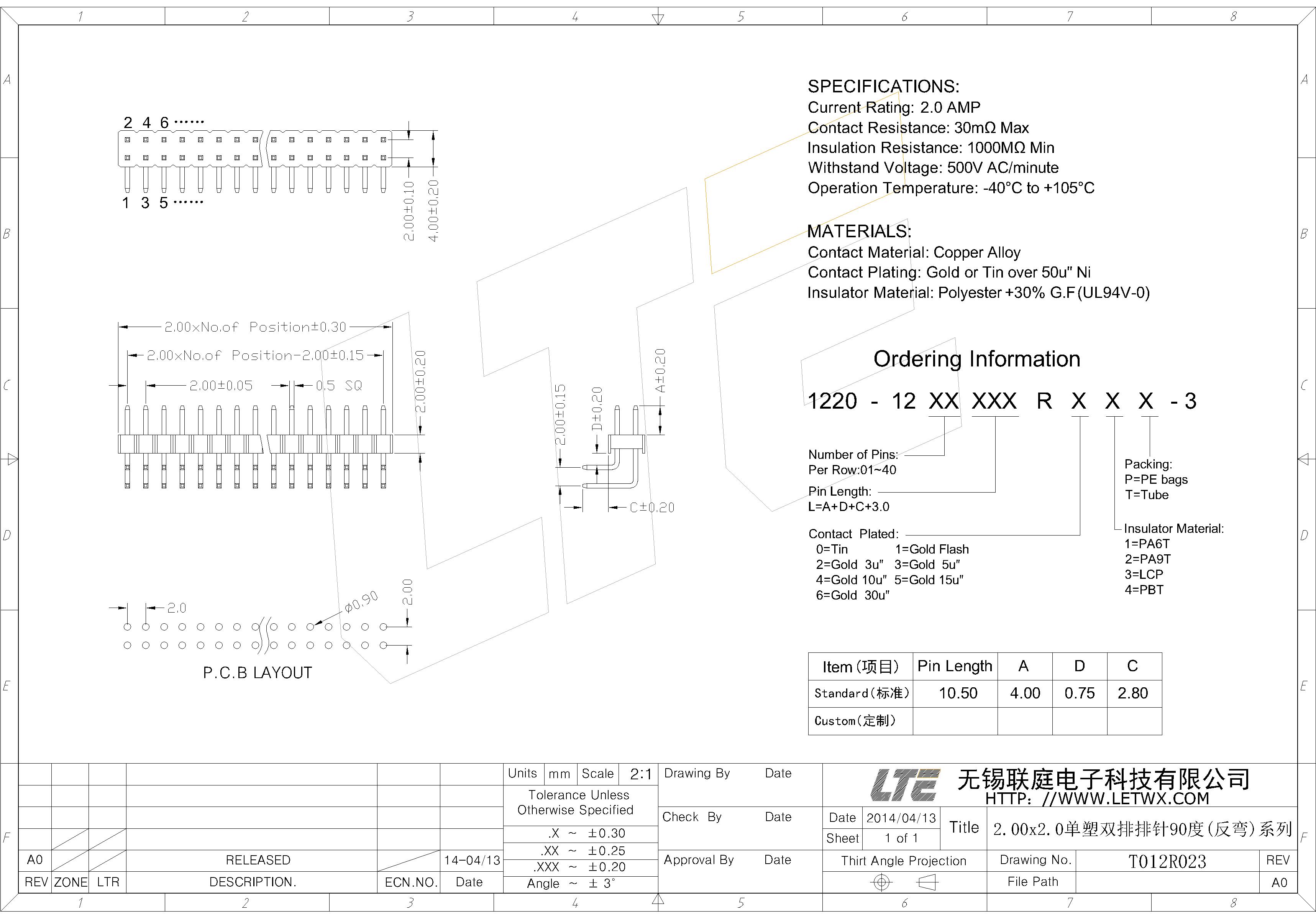 五金电镀(Contact Plating):镍底50U",外镀金或锡(Gold or Tin over 50u" Ni)