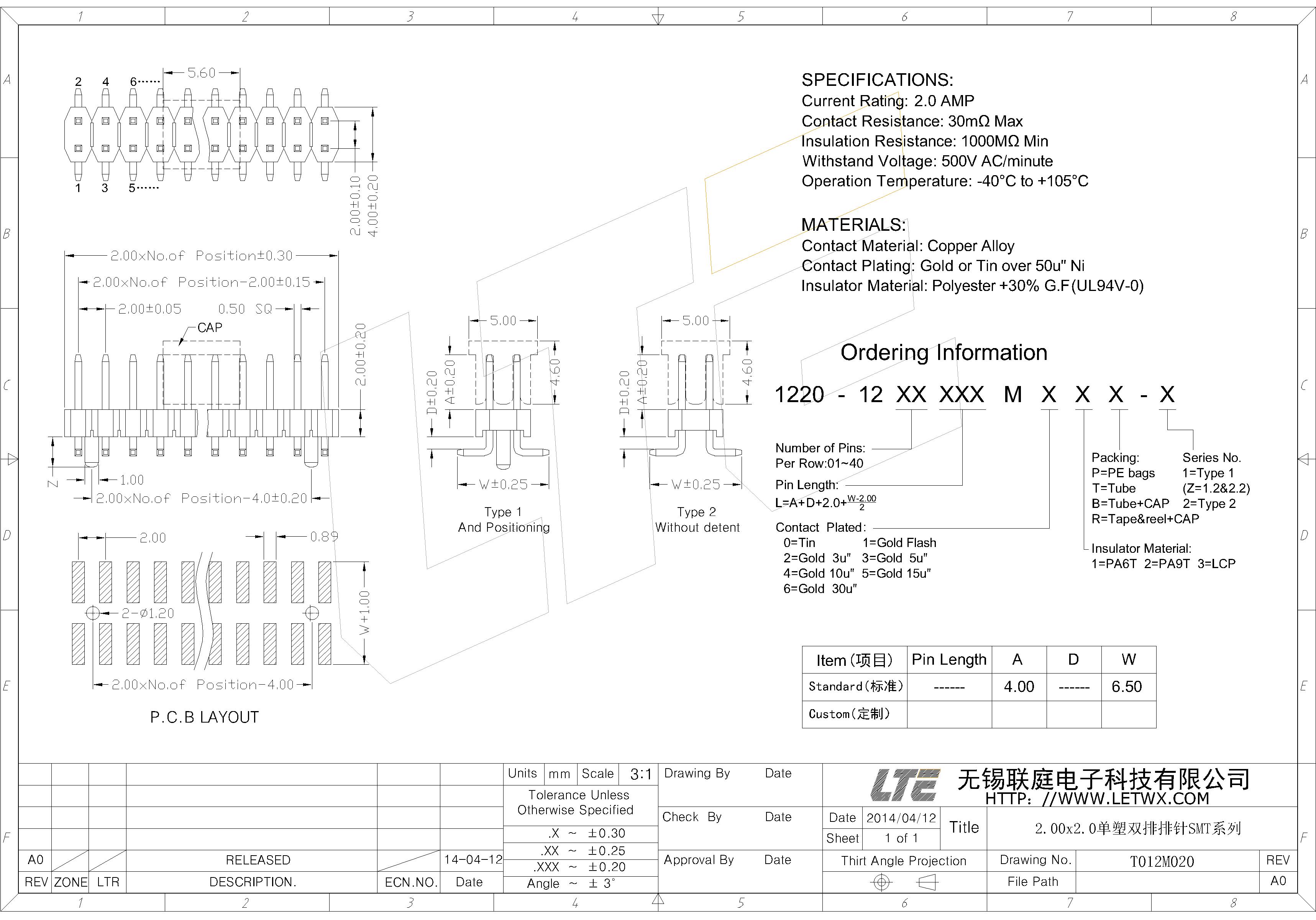 五金电镀(Contact Plating):镍底50U",外镀金或锡(Gold or Tin over 50u" Ni)