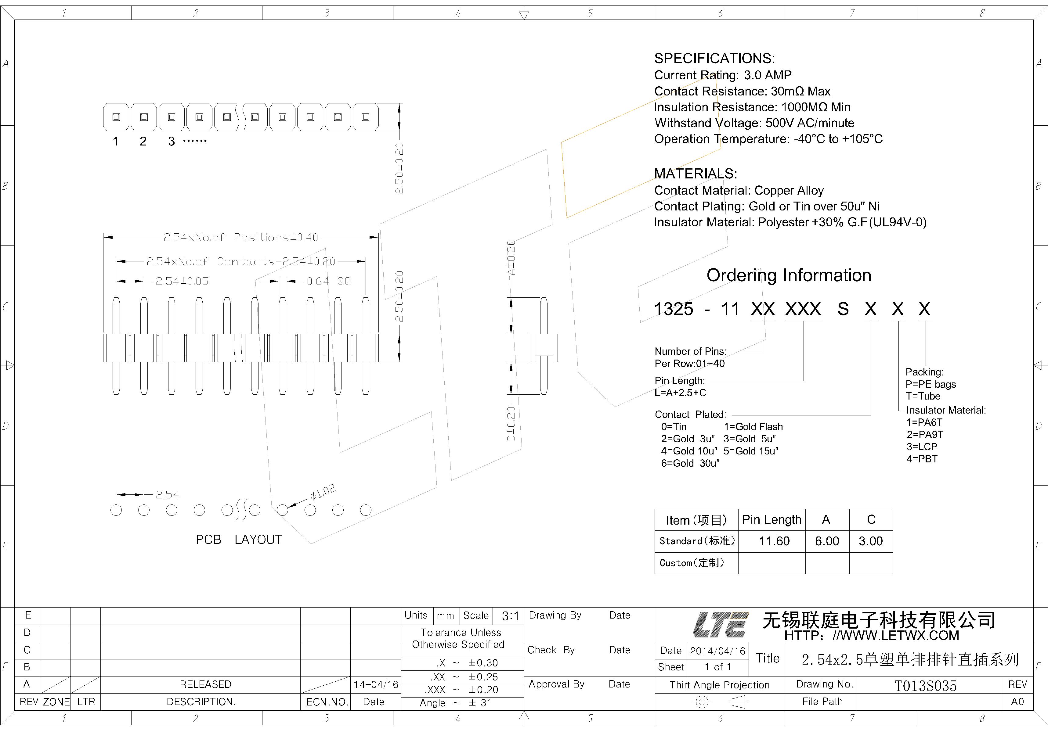 五金电镀(Contact Plating):镍底50U",外镀金或锡(Gold or Tin over 50u" Ni)